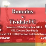 Evo-Stik Northern Premier First Division South Saturday 26th December 2015 Romulus FC 2-0 Tividale FC Once again Tividale failed to register anything in the points department in a game that they never really did enough to threaten the home side. Click here for full report